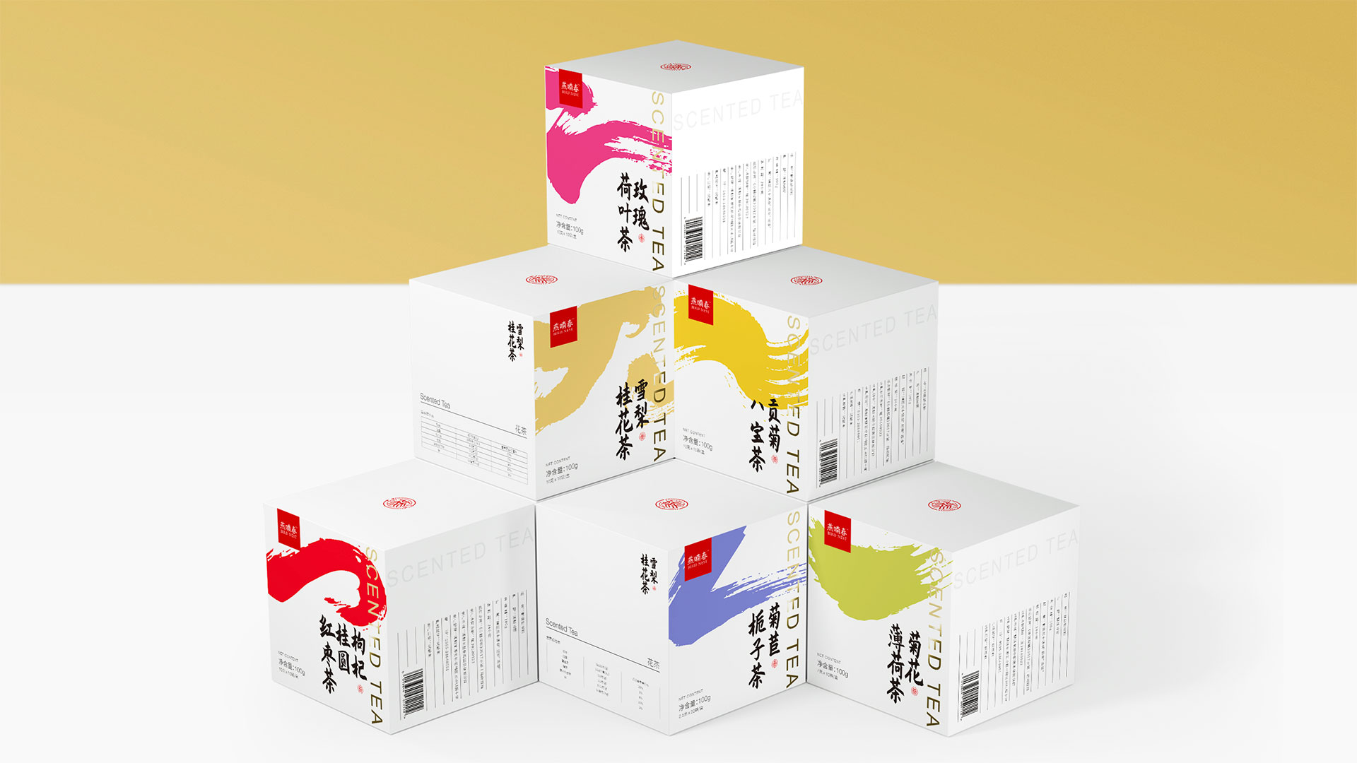 “BIRD NEST-燕喃春"以歷史文化為設(shè)計(jì)理念,圍繞“文化、時(shí)尚、女性、簡(jiǎn)潔”,傳遞”養(yǎng)生、歷史、年輕、休閑、便捷、品質(zhì)”等概念,于是便有了以“筆墨”為包裝圖形設(shè)計(jì)的基礎(chǔ)傳遞,筆畫(huà)的形態(tài),方與圓、尖與鈍、重與輕、快與慢、粗與細(xì)、等等,均出于用筆畫(huà)之具體形。筆墨揮灑出的無(wú)數(shù)種可能性拼配出了無(wú)數(shù)種茶味,又與時(shí)尚茶色相結(jié)合。將花茶歷史的濃厚筆墨與現(xiàn)代時(shí)尚明快的色彩聯(lián)結(jié),傳遞出的濃郁茶香和多層次的口感,讓消費(fèi)者記住每一款茶香。